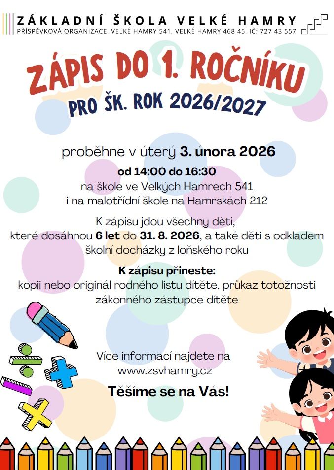 Zápis do 1. ročníku pro školní rok 2026/27