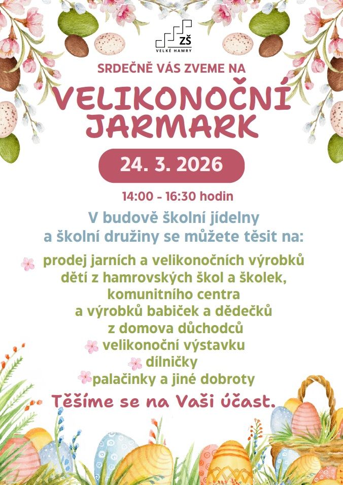 Srdečně Vás zveme na velikonoční jarmark, který se bude konat 24. 3. 2026 od 14:00 do 16:30 v budově školní jídelny. Podrobnosti naleznete v příspěvku.